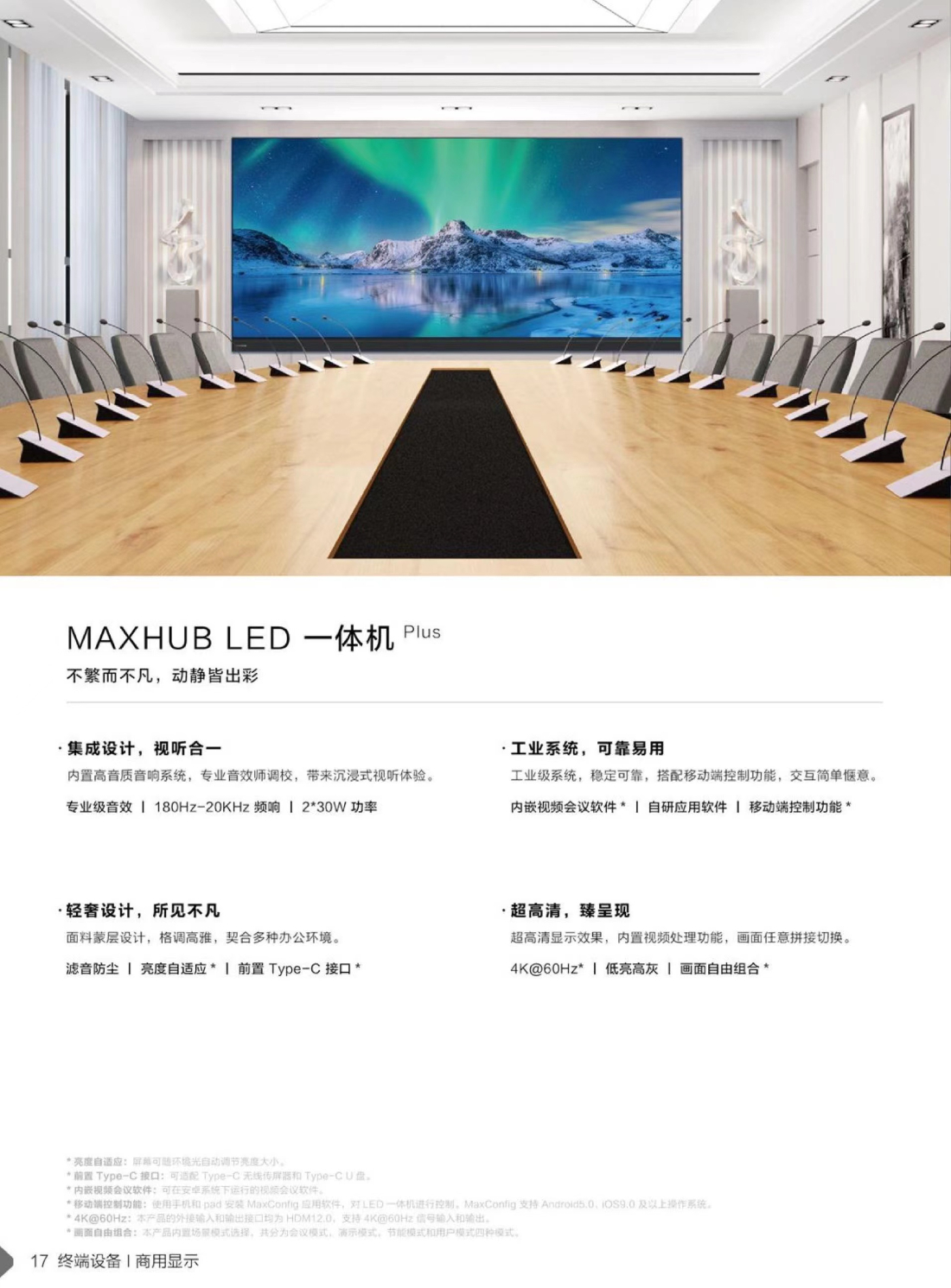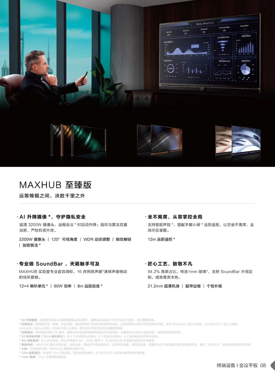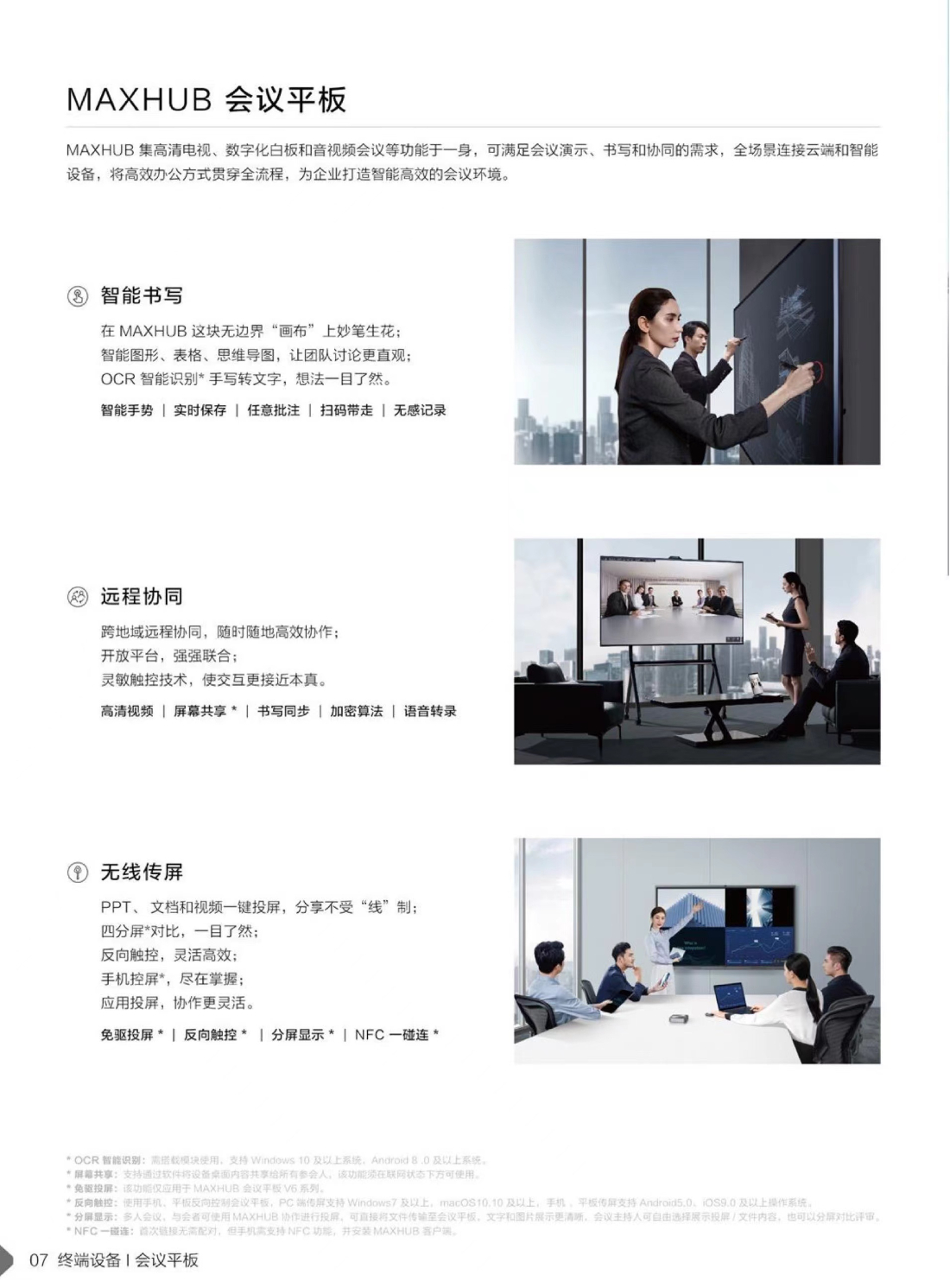 MAXHUB是視臻科技的自主*,誕生于2017年,是國內(nèi)會議平板品類的開創(chuàng)者和引領(lǐng)者,來自第三方奧維的數(shù)據(jù)顯示,2022年MAXHUB銷量市占率達(dá)28.8%。截至目前,MAXHUB已成功走進(jìn)全球78個*,超50萬間會議室都能看到MAXHUB的身影,超80%中國500強(qiáng)企業(yè)都在使用MAXHUB提升會議和協(xié)同效率*。 創(chuàng)新成就更多可能,MAXHUB持續(xù)根據(jù)用戶需求迭代升級技術(shù)和產(chǎn)品。2023年,MAXHUB首度在行業(yè)內(nèi)定義三大空間,發(fā)布三大空間數(shù)字化解決方案,以覆蓋全場景的協(xié)同終端新品,為組織帶來更高效的會議辦公體驗。 服務(wù)無止境,滿意無終點。MAXHUB始終堅持以“用戶為中心”,擁有完善的售后體系,2000個售后服務(wù)網(wǎng)點和10000名官方認(rèn)證工程師,為全國用戶提供設(shè)備咨詢、送貨、安裝、培訓(xùn)、維修等*專業(yè)服務(wù),對 于一、二線城市,還提供48小時內(nèi)上門服務(wù),真正做到“只要有MAXHUB的地方,就會有 MAXHUB的服務(wù)”。 打造更好的產(chǎn)品,追求更高的品質(zhì),提供更優(yōu)的服務(wù),MAXHUB將致力于提升協(xié)同共創(chuàng)的效能,把高效轉(zhuǎn)化為企業(yè)的核心生產(chǎn)力,為社會創(chuàng)造更大的價值。